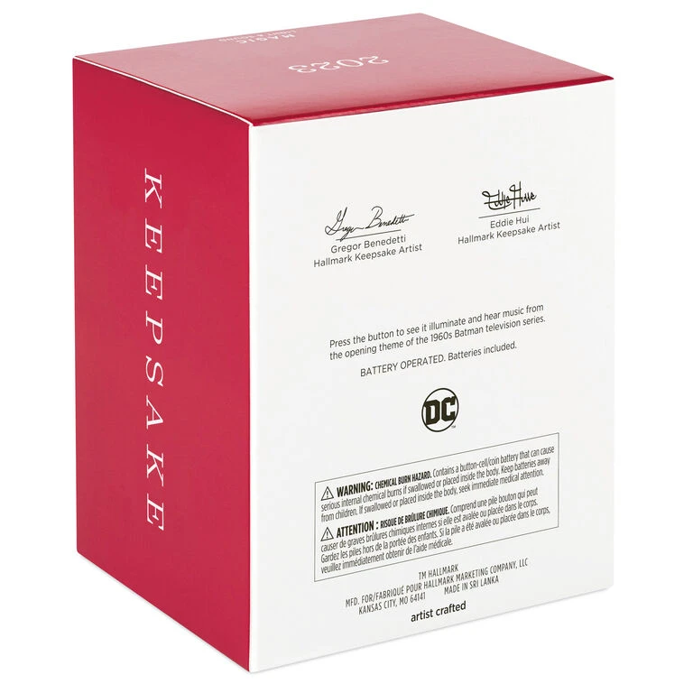 - Key Features: Press the button on the Magic Light and Sound ornament to see it illuminate and hear music from the opening theme of the 1960s Batman television series.