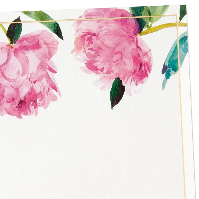 - Stationery sheets feature a bright pink peony design and gold foil accents.