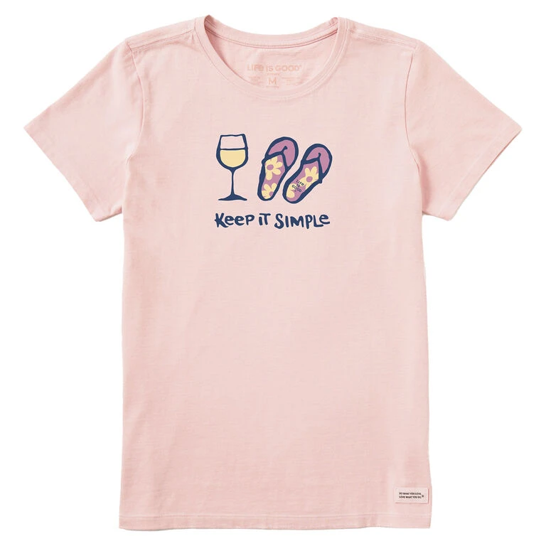 Show off your skill at being chill when you wear this pretty pale pink Life Is Good T-shirt featuring a wine glass and a pair of flip-flops. Perfect for lazy summer days or beach vacays, this fun “Keep it simple” tee pairs well with a glass of relaxation. Washed for softness and comfort, the short sleeve, crew-neck Crusher Tee Is easy to wear and perfect to layer, with a slight waist shape and ribbing at the neck.