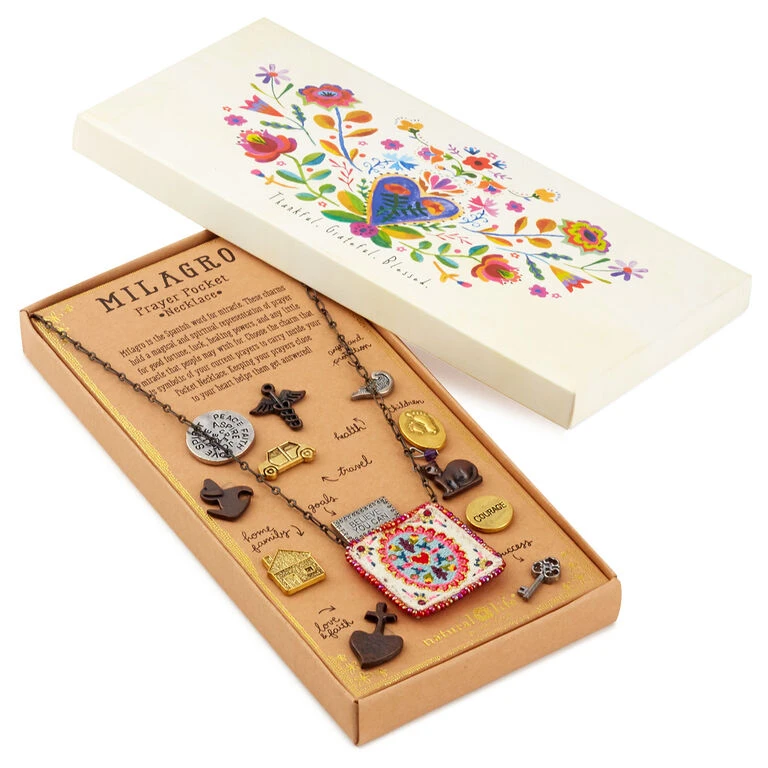 Keep your biggest prayer for the day top of mind and close to your heart with this charming necklace. Inspired by Mexican culture and “milagro,” the Spanish word for “miracle,” this pretty piece of jewelry features an embroidered pocket to hold one of several small charms that represent a current goal, thought or prayer on your mind. Makes a thoughtful gift for birthdays, graduations, baptisms or special encouragement.